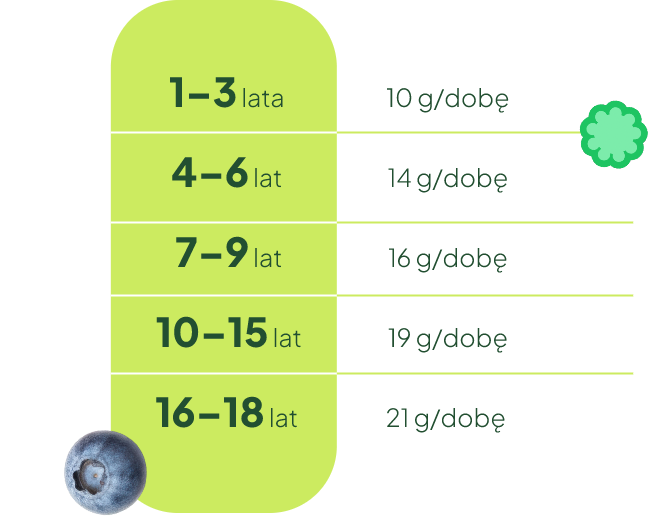 Orientacyjne zapotrzebowanie na błonnik pokarmowy u dzieci i młodzieży przedstawia się następująco: